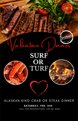 Join us for a special Surf or Turf Valentine’s Dinner, perfect for date night, anniversaries, or a cozy night out.